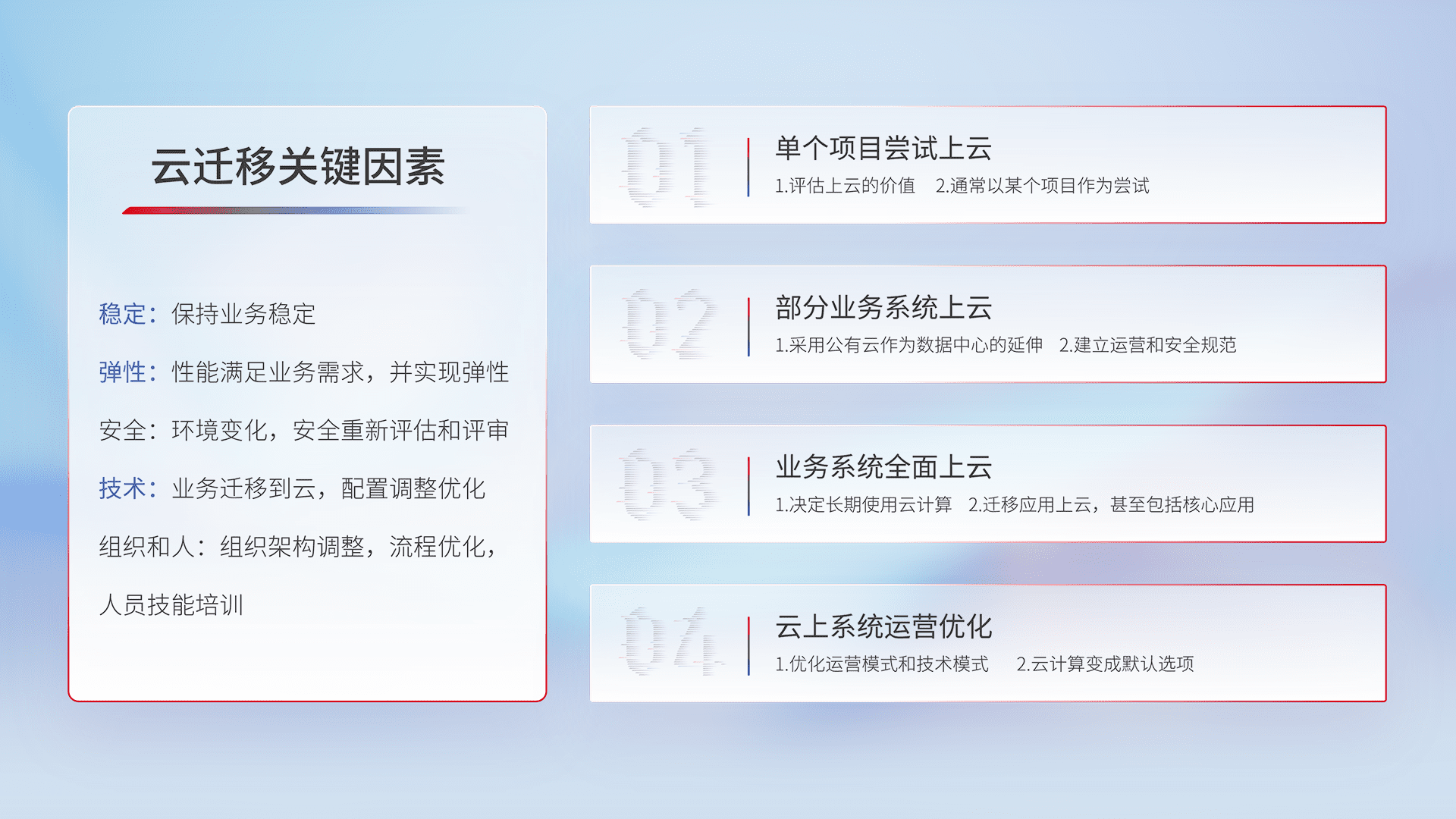 结合实际业务,,,,从规划设计、、、、云平台选型、、、云原生改造、、、、数据迁移、、、、集成交付,,,,迁移全过程为客户识别最佳上云路径,,,做好风险识别管理,,,,设计网络架构、、身份权限、、、、安全审计合规、、、、操作审计、、、、日志审计、、监控告警策略、、多站点容灾设计等,,对云上基础设施进行整体规划,,提升IT治理水平,,,,以满足弹性、、高可用、、、高性能的需求。。。。